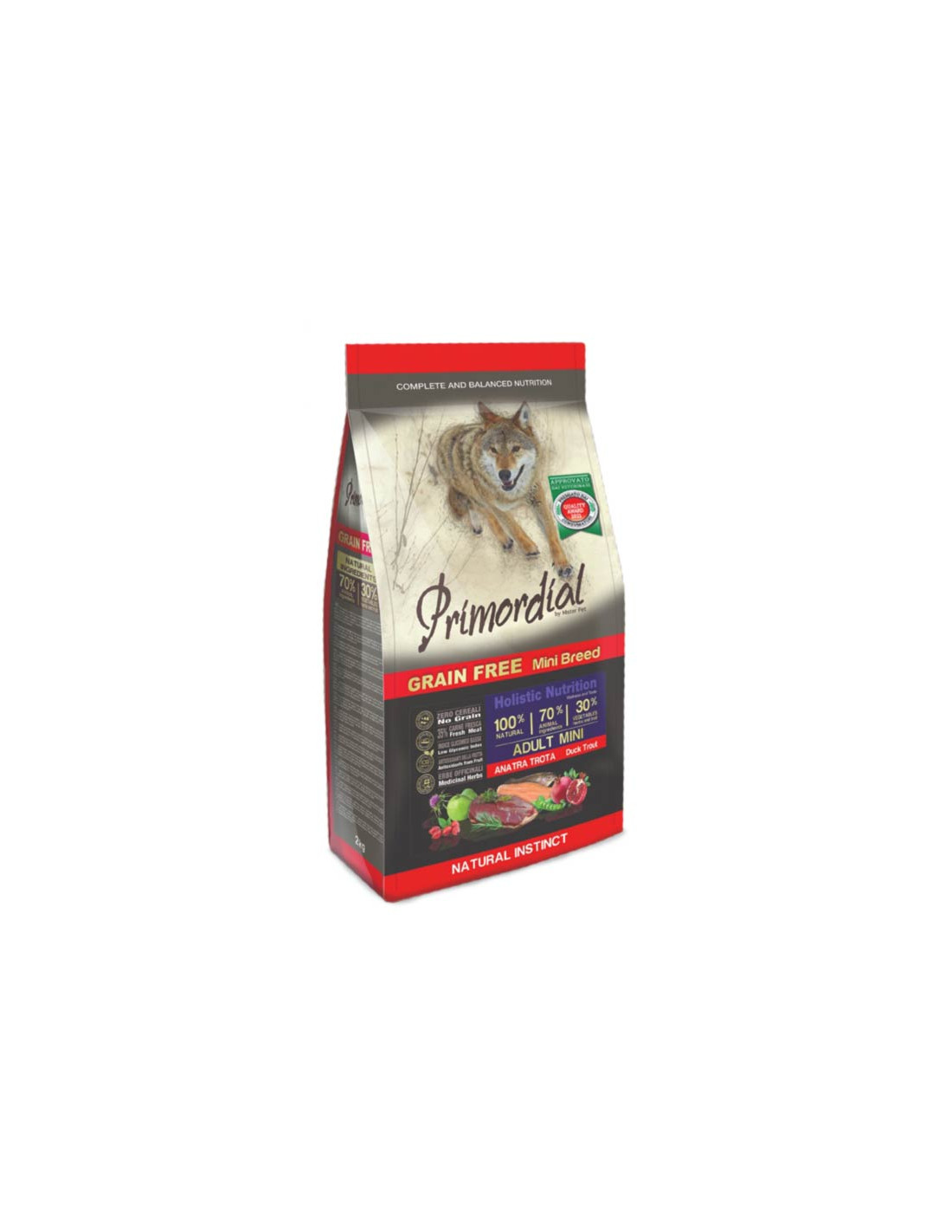 Primordial Pienso Grain Free para Perros Adultos Mini de Pato y Trucha Pienso sin cereales para perros adultos mini con 35% de trucha fresca y 25% de pato deshidratado. Proteínas de fácil digestión y omega-3 para mantener piel, pelaje y sistema cardiovascular saludables. Con piña, granada y rosa mosqueta, que apoyan la digestión y tienen propiedades antioxidantes.