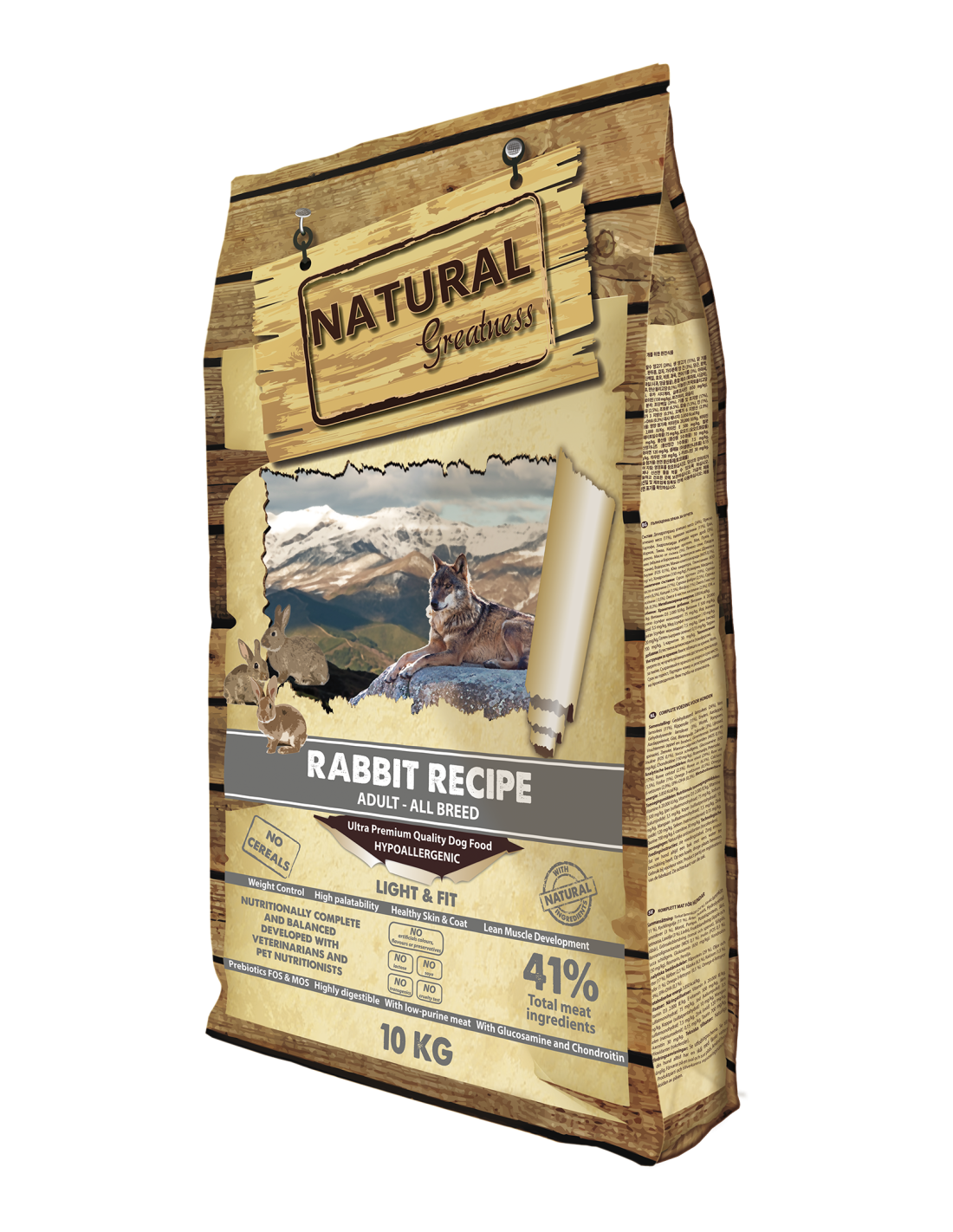 Natural Greatness receta de conejo es una excelente receta ultrapremium, hipoalergénica y monoproteica formulada sin cereales para perros adultos, adultos esterilizados o senior con tendencia al sobrepeso.