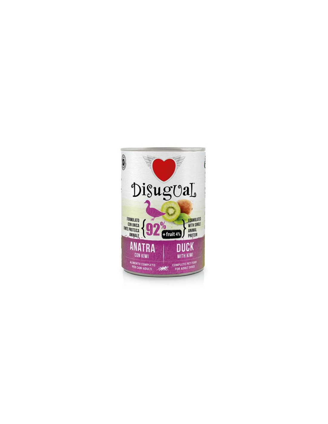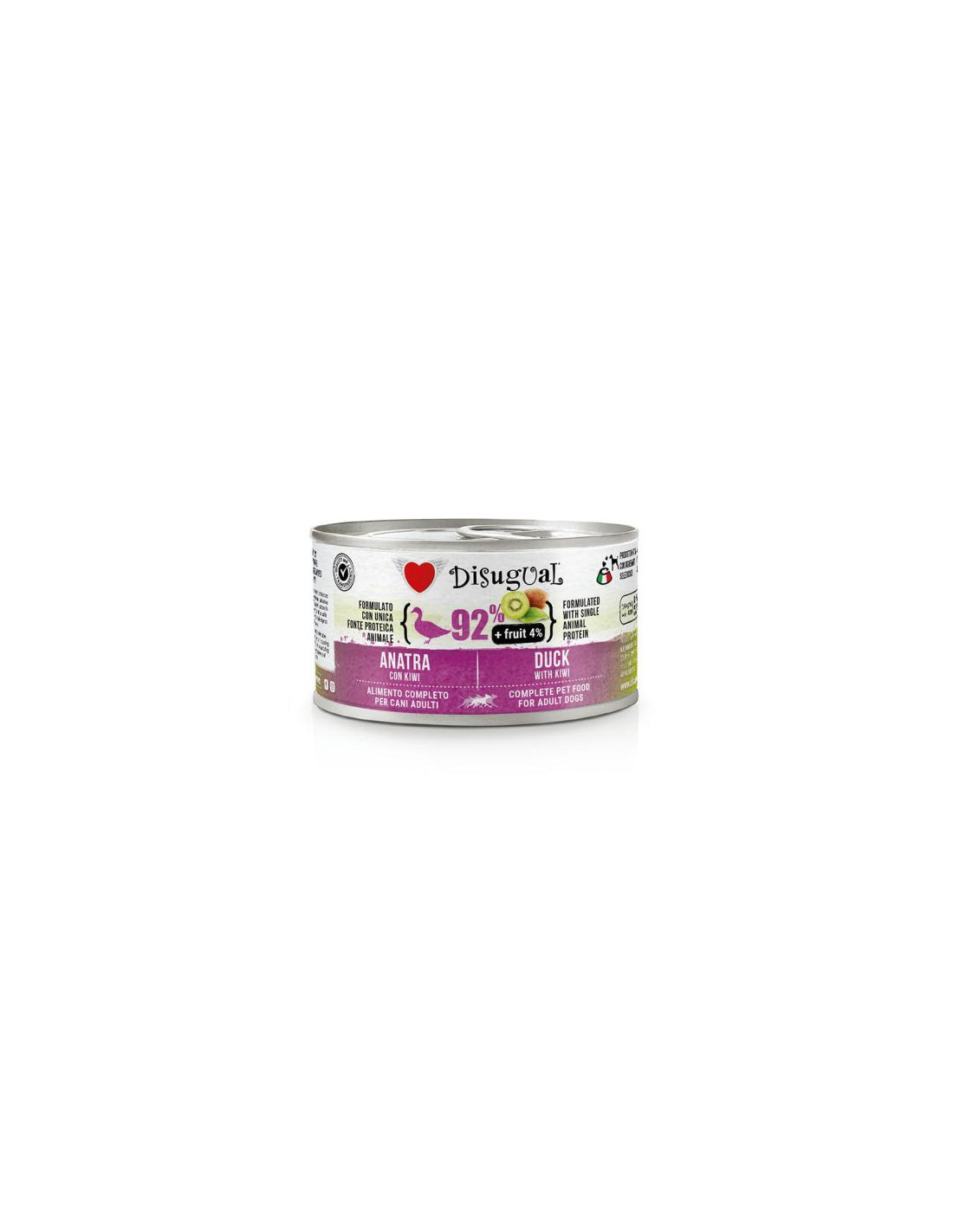 Disugual Lata Húmeda Pato y Kiwi es un alimento completo y natural, monoproteico y con un 92% de pato. Sin cereales ni gluten, ideal para perros con intolerancias.