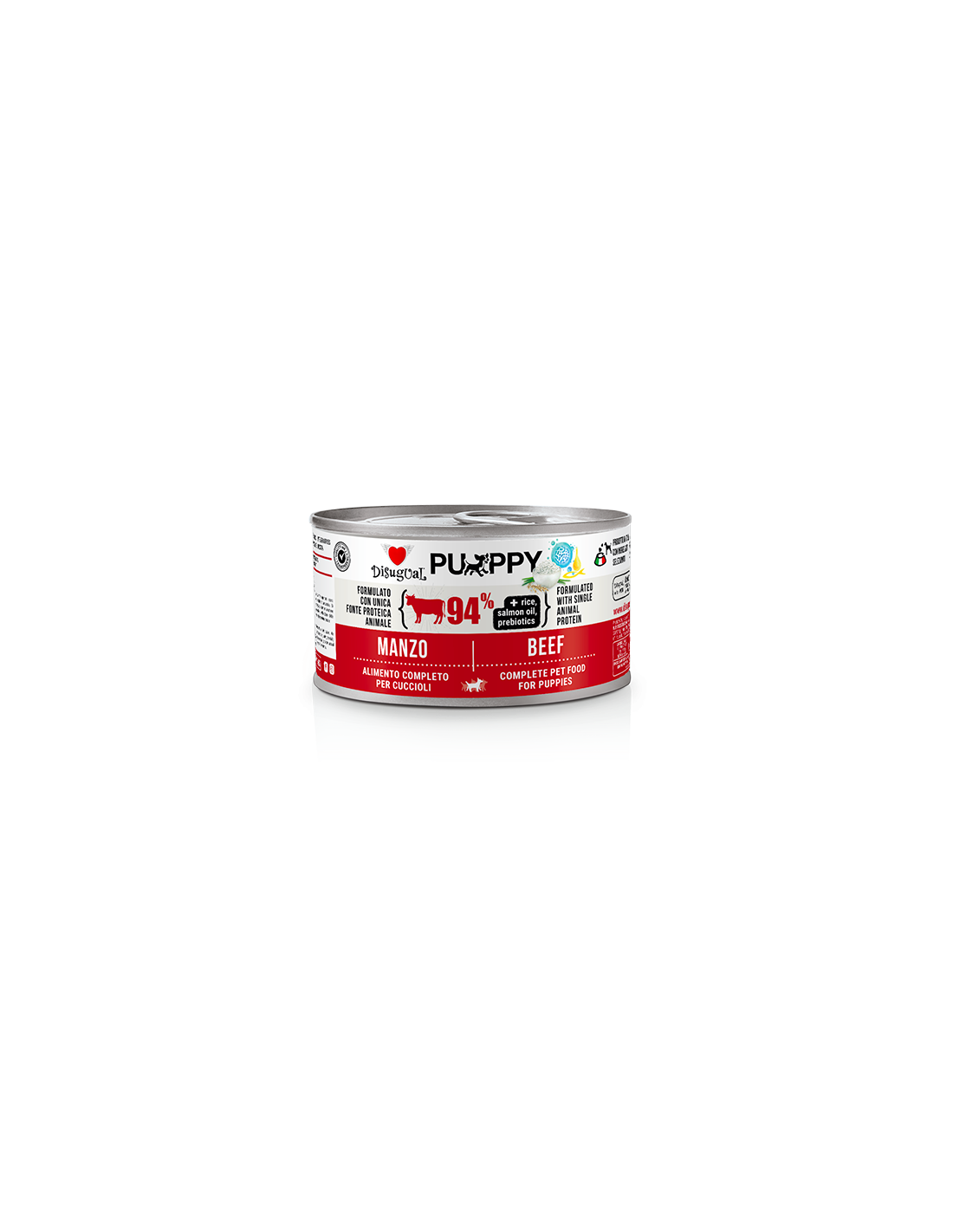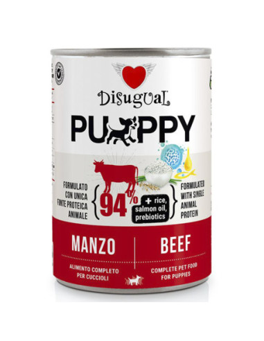 Disugual Puppy es un alimento húmedo completo para cachorros. Contiene una única fuente de proteína animal, con prebióticos y antioxidantes que favorecen la salud intestinal. Sin gluten ni conservantes, es ideal para cachorros de todos los tamaños.