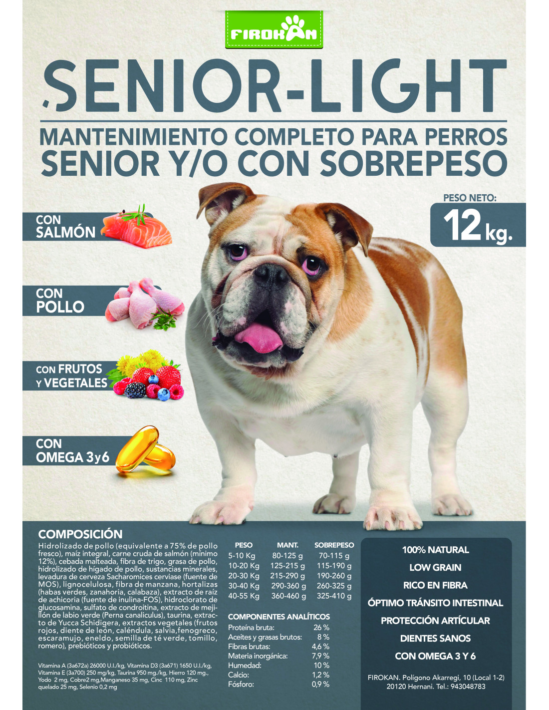 Firokan Senior / Light es un alimento completo superpremium para todas las razas especialmente pensado y formulado para perros con sobrepeso o con tendencia a padecerlo bien sea por motivos de actividad, metabolismo o edad avanzada.