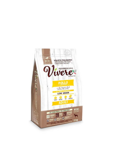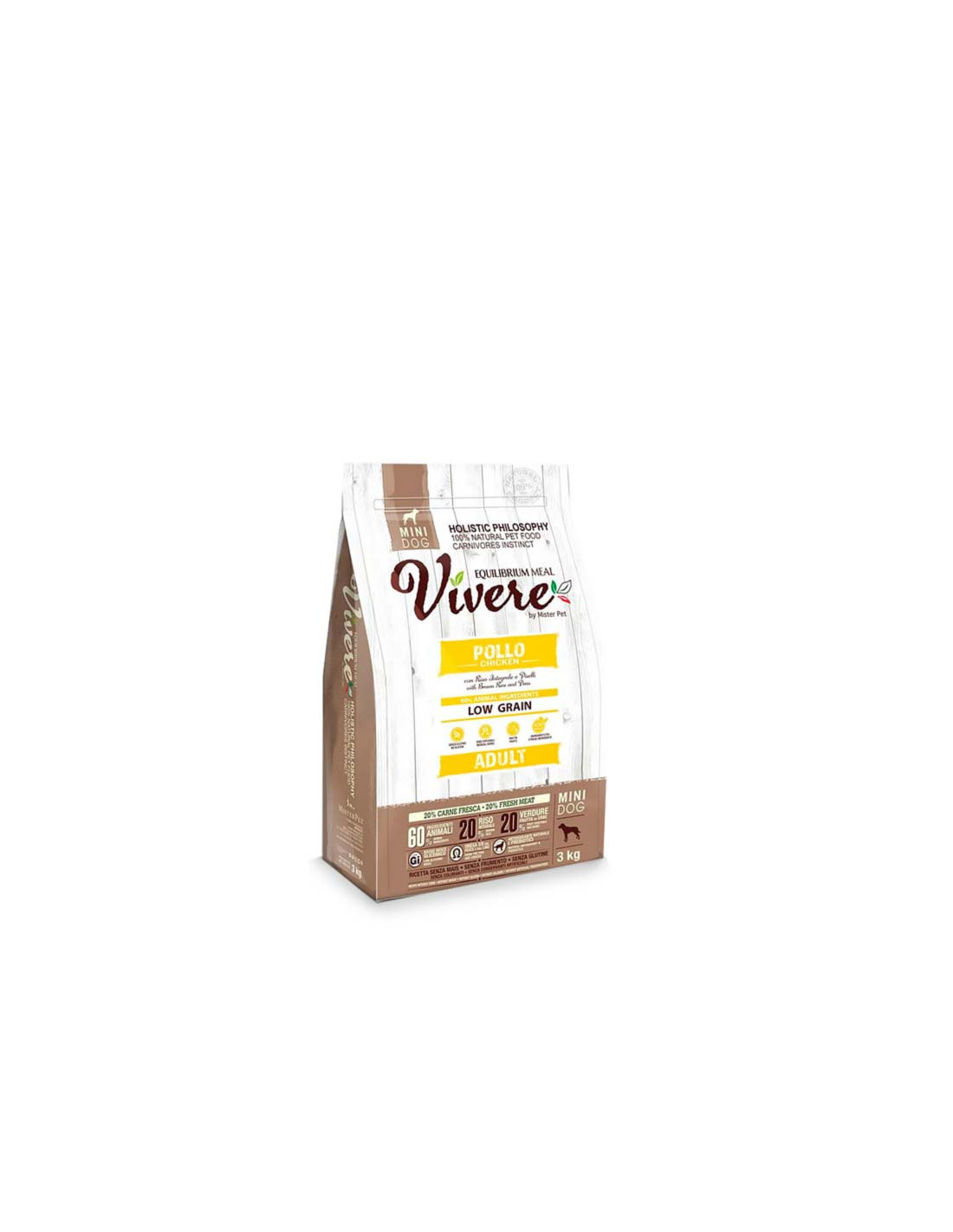 Vivere Low Grain Razas Mini Pollo Alimento completo y 100% natural, formulado específicamente para perros adultos de razas pequeñas, con pollo, arroz integral y guisantes como ingredientes clave.